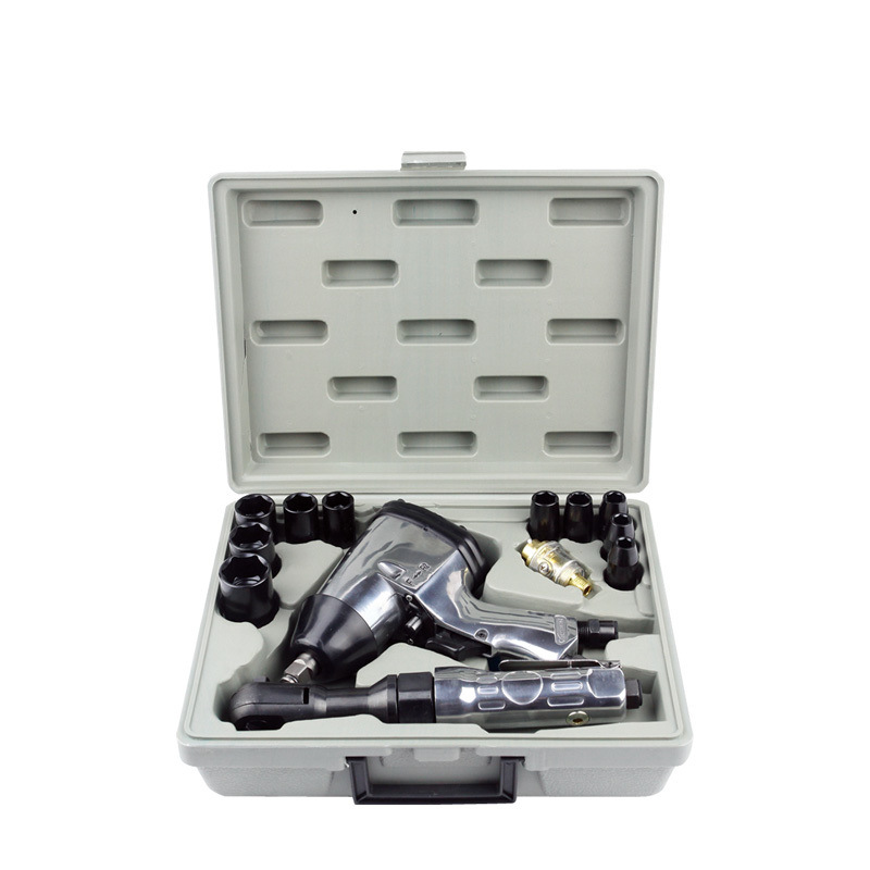Комплект включает 10 воздушных розетки в размерах от 9 до 27 мм, шестигранный ключ для дополнительной универсальности, сосок для легкого подключения воздушного шланга, мини-масляник для смазки инструмента,масляный горшок для хранения смазочных материалов, и прочный корпус для транспортировки и хранения.